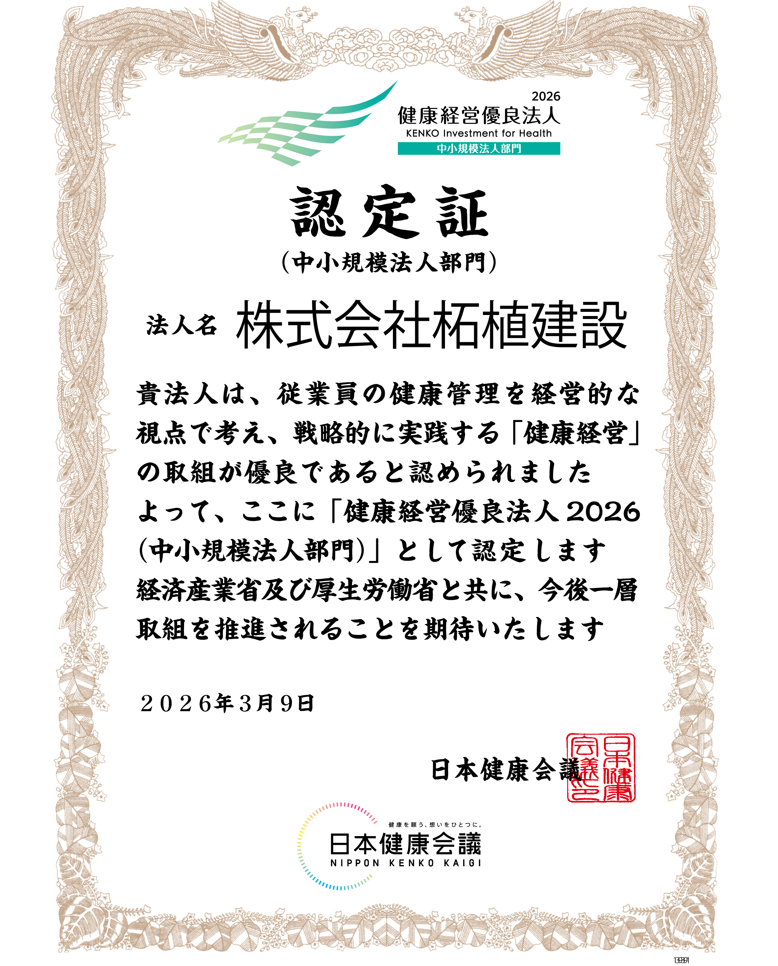 従業員の皆さんの健康管理を会社として戦略的に支援している企業にされる認定です。